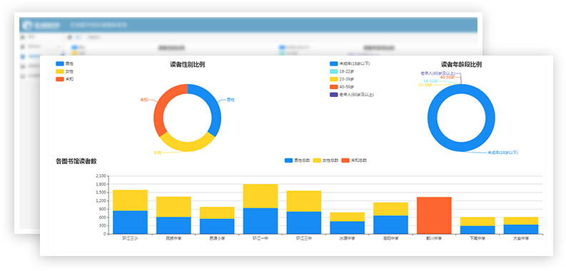 方便教育局实时统计各个区域学校的借还书籍的情况、对书籍22大分类和总 体5大类的类别呈现,实现对学校图书馆的读者进出量的实时了解。