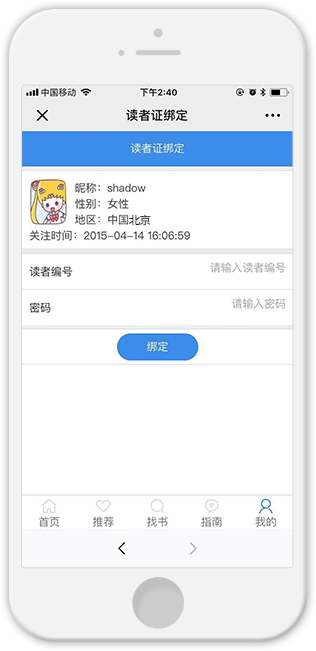 输入读者账号和密码,可与微信号一键绑定读者证,生成独有二维码。
