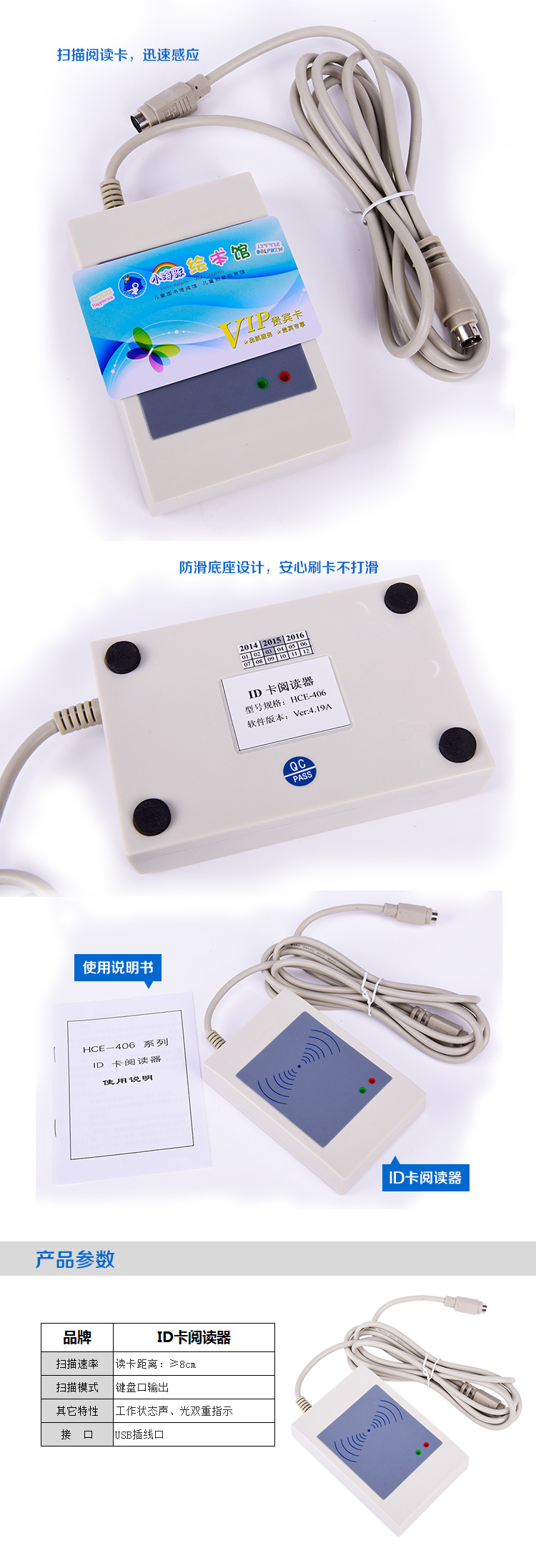 2.手持ID卡片靠近阅读器正下方感应区垂直读卡。