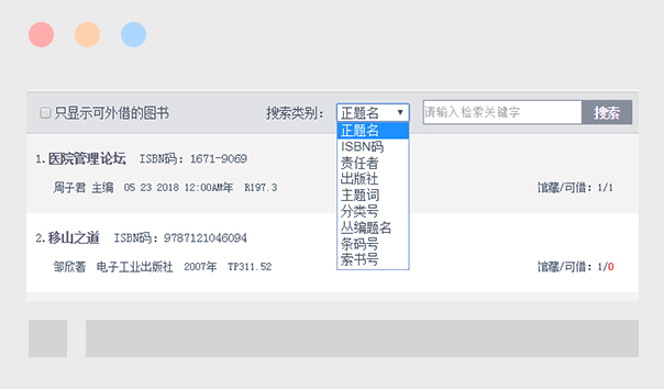 读者可通过中图分类、馆藏地、典藏归类等不同的查询条件来进行分类检索,读者也可以选择显示可外借的图书。