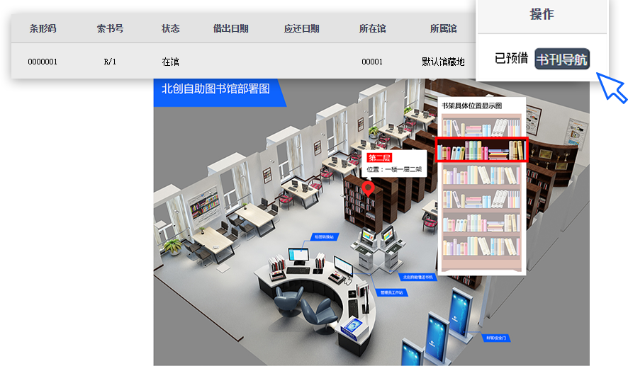 读者可以点击“书刊导航”来查看某一本书所在 的具体位置,精确到X楼X排X层X架,让读者迅速 获取图书位置。