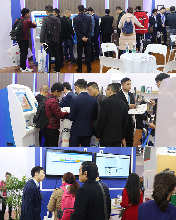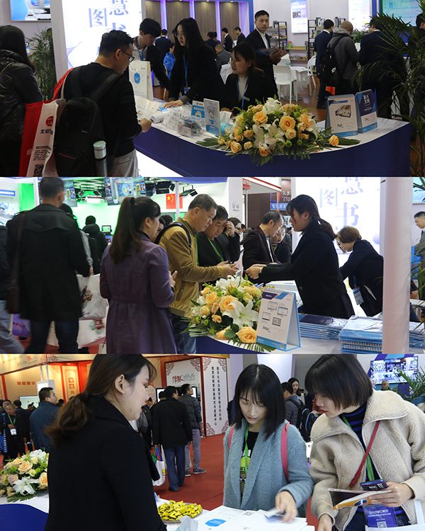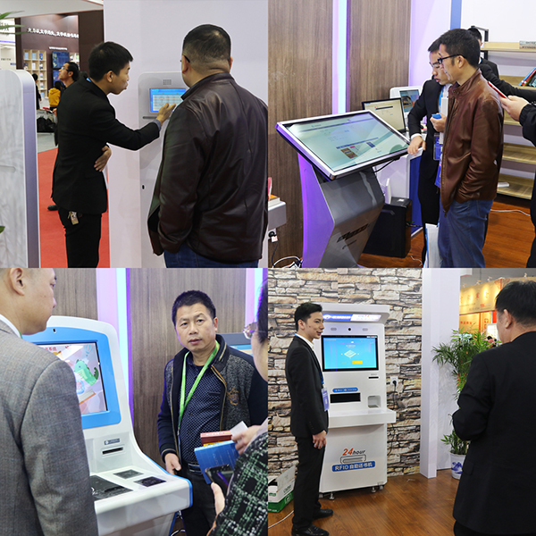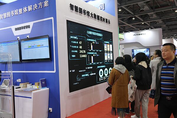 北创科技展台上全程再现了传统和智慧图书馆两种图书管理软硬件系统。其中,RFID智慧馆的自助借还、自助办证机均采用当前流行的人脸识别和微信、支付宝等移动支付技术。而为方便客户查看本地图书馆的实时动态所研发出的一款全新的系统——图书馆大数据实时展示平台,则成为展台外墙的绝对主角,让用户通过它得以即时了解、分析图书馆各时段进出馆人数、借还书人数、热门图书排行榜等数据。