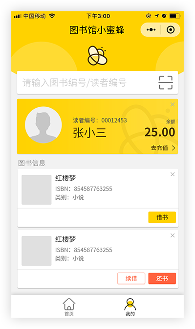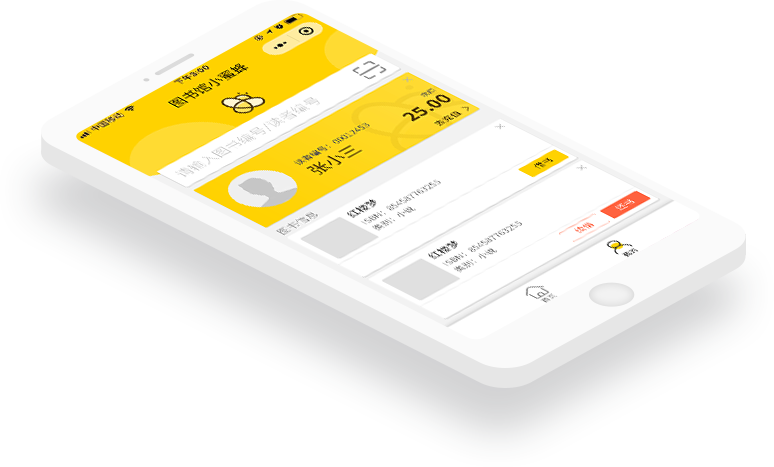 北创“图书馆小蜜蜂”微信小程序可实现图书管理员手机给读者办理借书、还书、续借管理。 专为图书馆管理员打造一种移动轻松自由的办公环境。